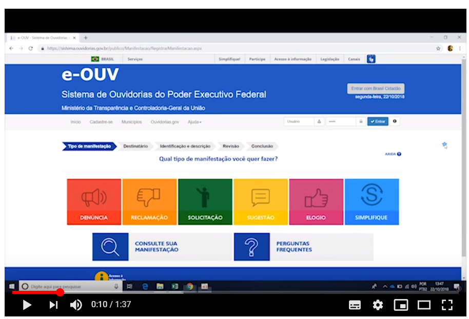 Conheça o Sistema e-Ouv, Sistema Informatizado de Ouvidorias do Poder Executivo Federal. Neste vídeo, apresentamos, brevemente, as principais funções do e-Ouv para quem trabalha com este sistema. Em caso de dúvidas, mande e-mail para suporte.e-ouv@cgu.gov.br. Acesse o e-Ouv: www.ouvidoria.gov.br.